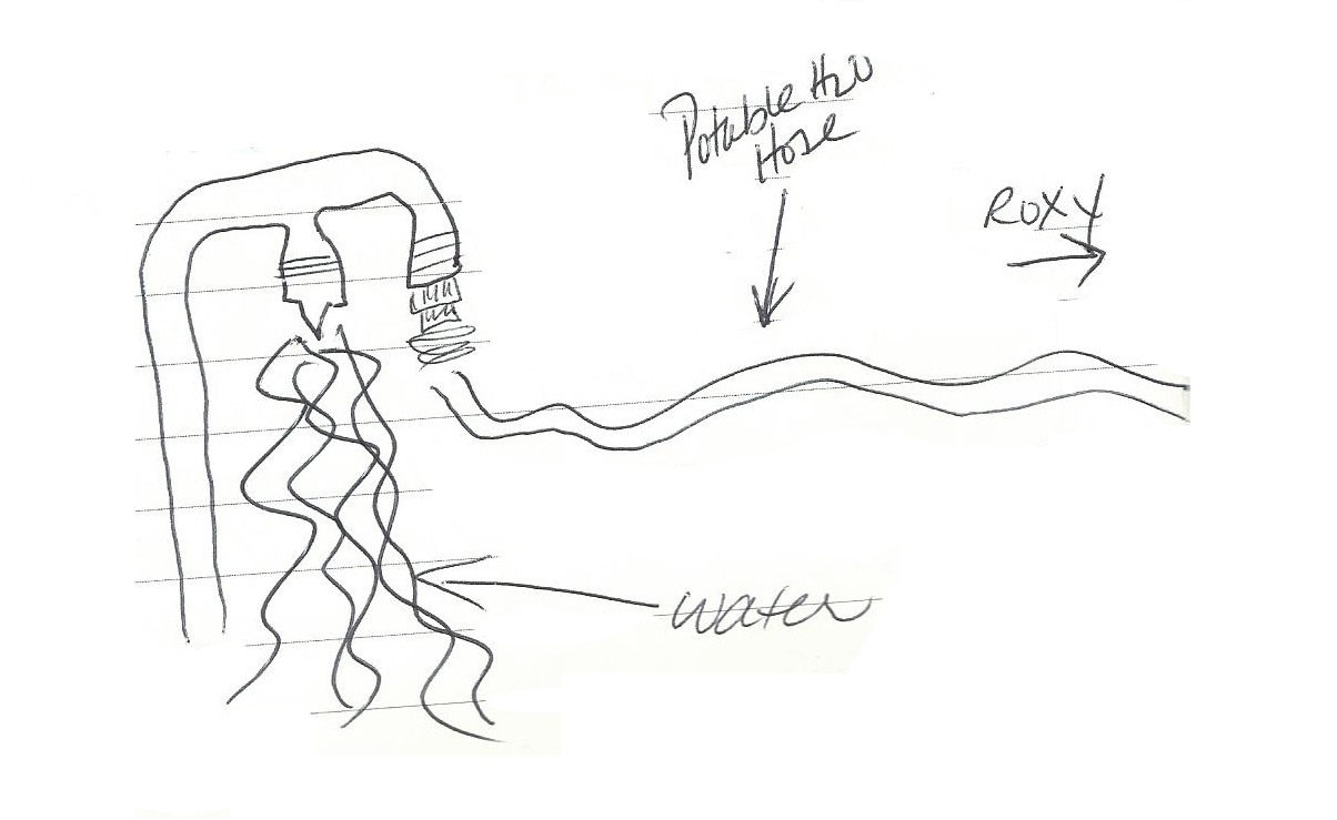 No instructions — or even vague guidelines — on the spigot. Owner's manual said simply, "Connect potable water hose to source." We were 100% positive we had the hose tight and in the right spot and positive that our little brass filter fixture was snug and on the correct spout. Yet, no matter what adjustments we made, our water would only dispense through a perfectly useless spout on the same spigot. Like this: