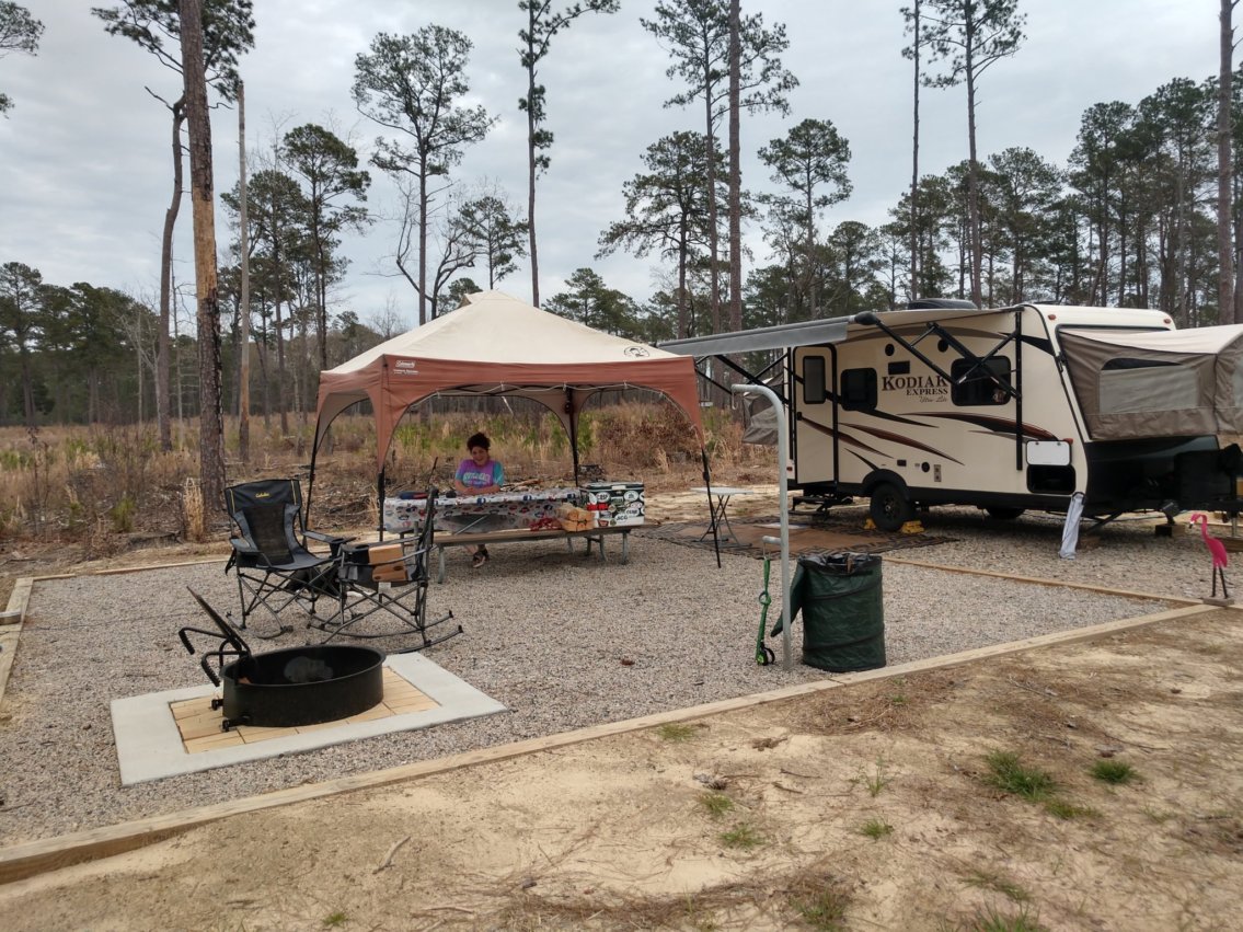 As we pulled into our spot at the brand new RV sites at Goose Creek State Park, Molly noted that we may be the first people to use the fire pit — the campground is that new. Some light rain on Friday night, but that didn't stop us from making Pie Iron Pizzas for dinner (and it didn't stop April from digging her holes!).